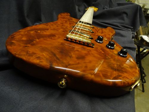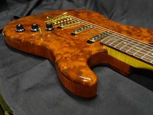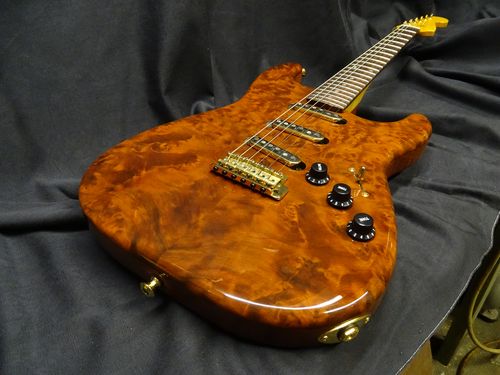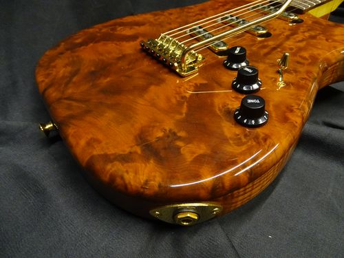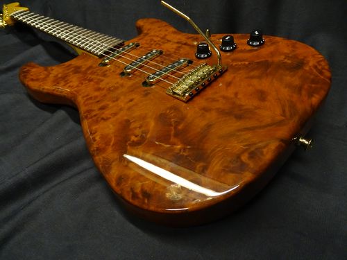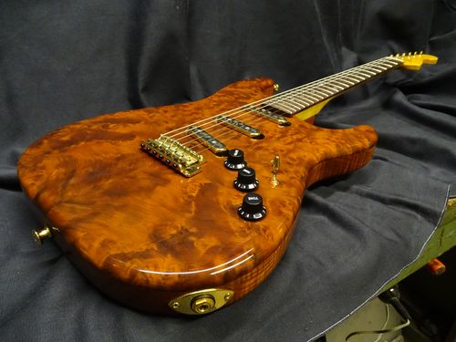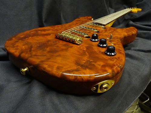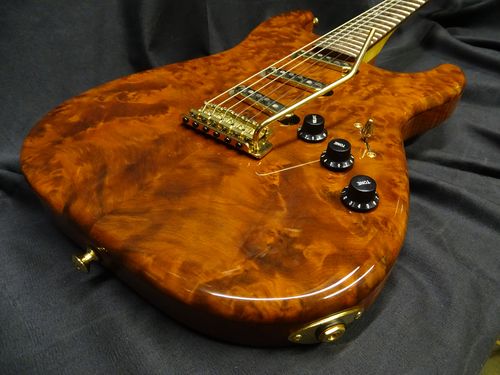 Modèle original avec un corps une seule pièce en frêne des Marais, table loupe de Thuya + ébène, manche érable ondé, touche palissandre avec repères Abalone et sillet os, mécaniques Kluson originales, micro Fender origine 59′, électronique CTS…