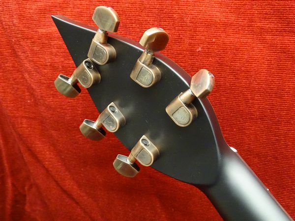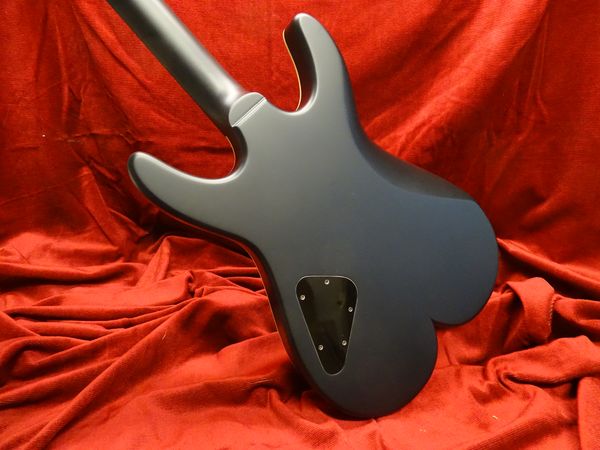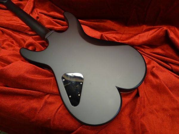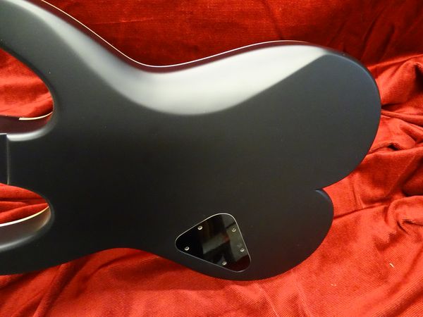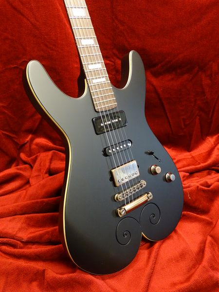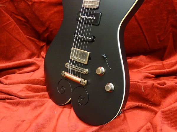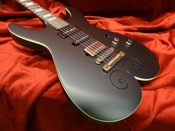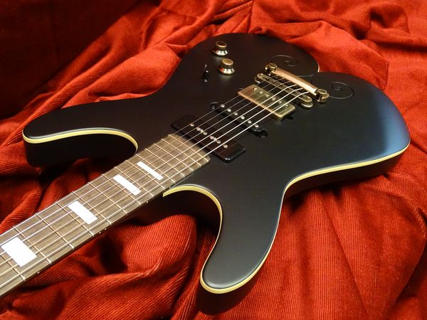 Corps et manche acajou massif du Honduras, touche palissandre de Madagascar avec repère nacre, accastillage et mécaniques Schaller « Vintage cooper », micro chevalet Humbucker, milieu single coil, manche P90 Nicolas Pain, finition noir mat.