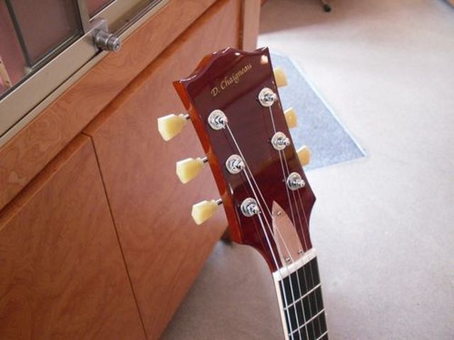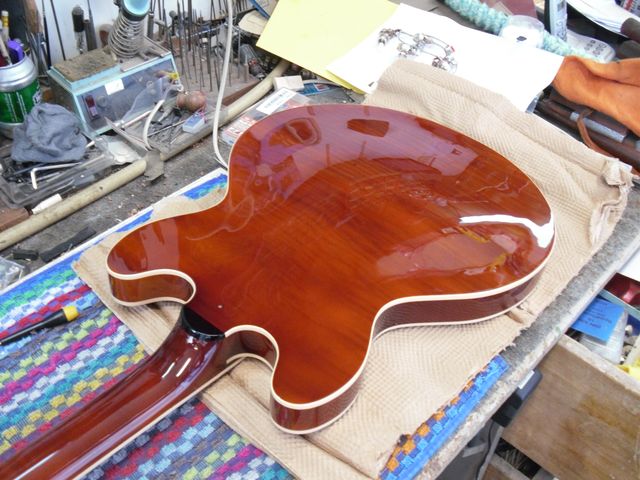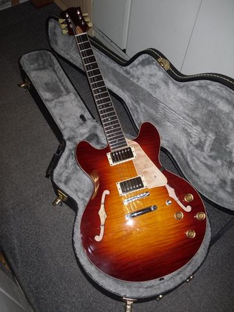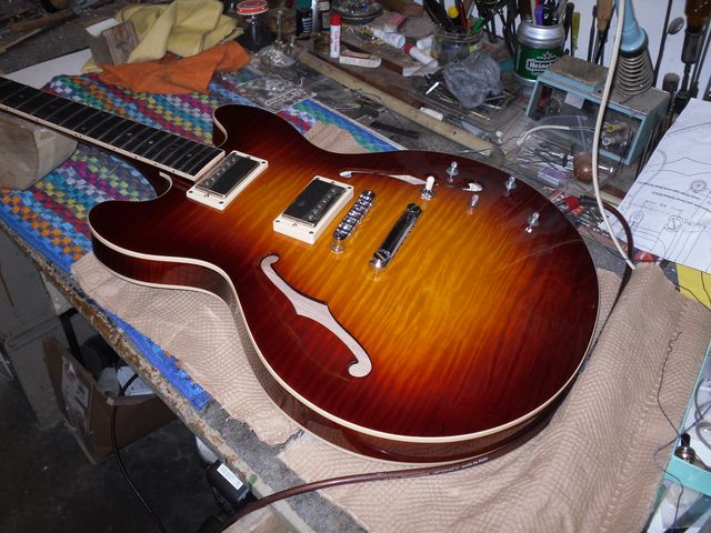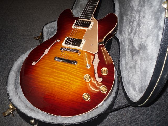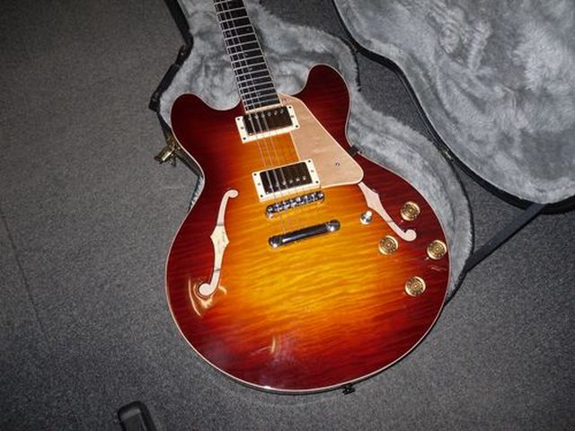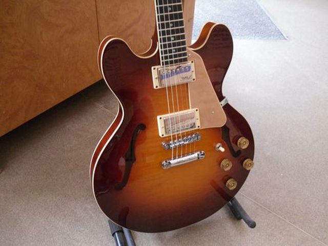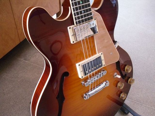 Table et fond érable ondé, éclisses érable moucheté, manche érable, touche ébène, mécaniques kluson tulipe nacrée, cordier/chevalet Gibson Nashville, micro neck / bridge Seymour Duncan 59′. Finition sun burst.