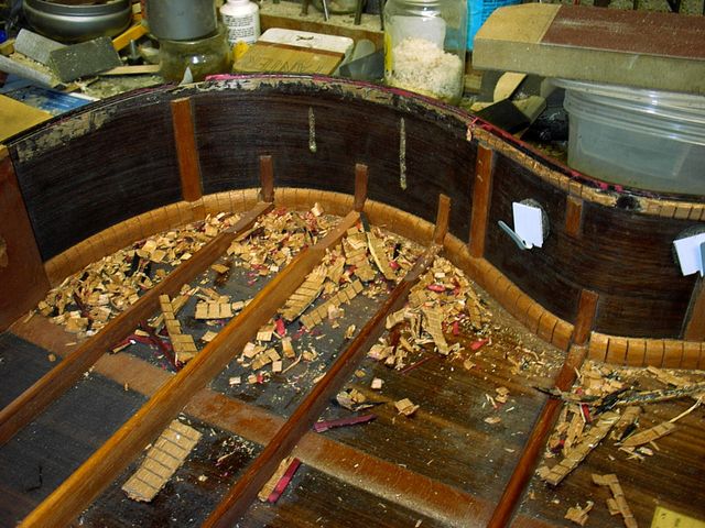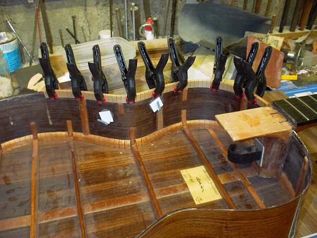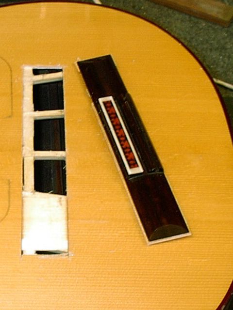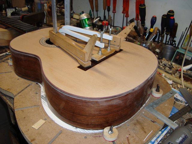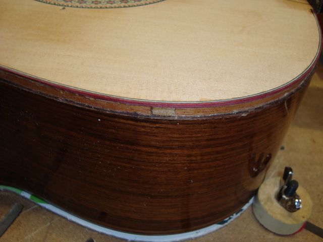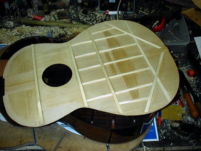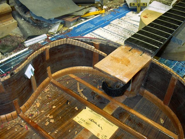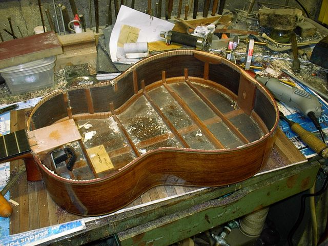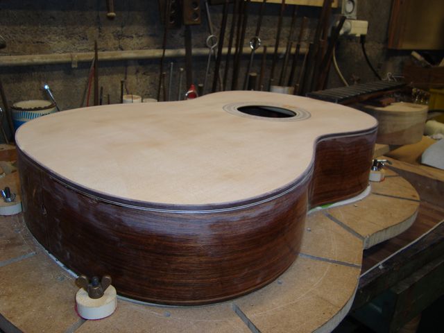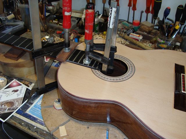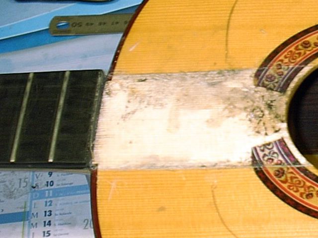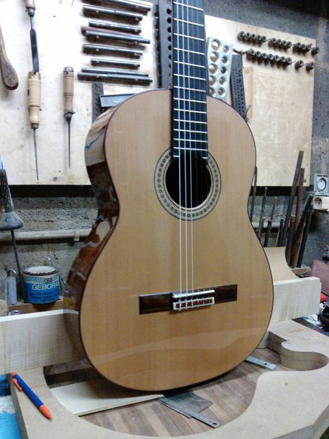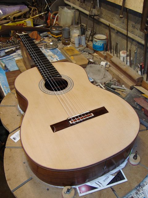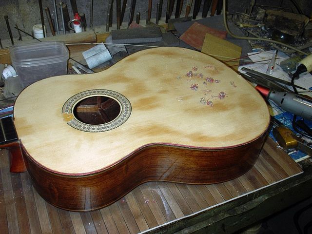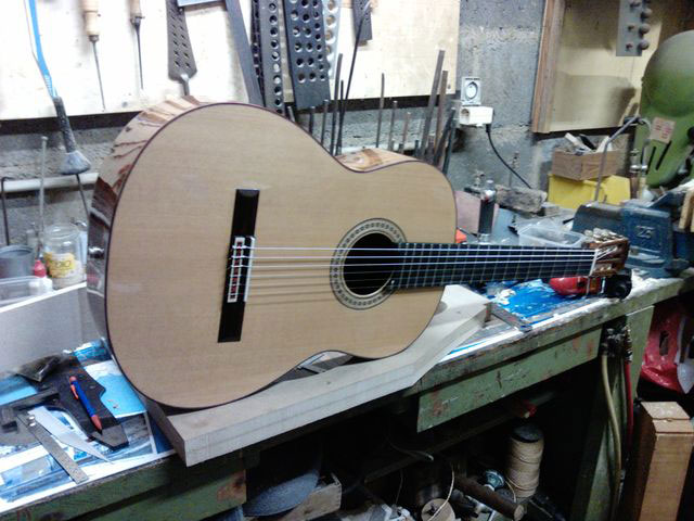 Changement de table d’harmonie classique Echange de la table d’harmonie, au modèle, pour cette guitare classique Suguiyama. Collée dessous la nouvelle table